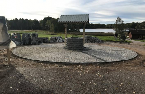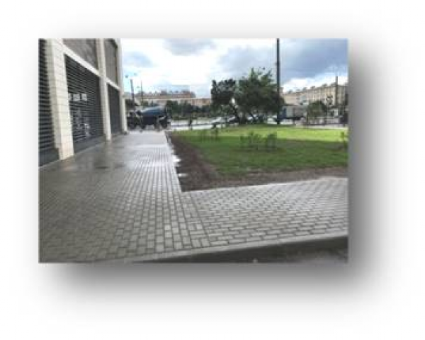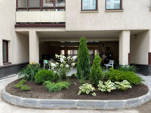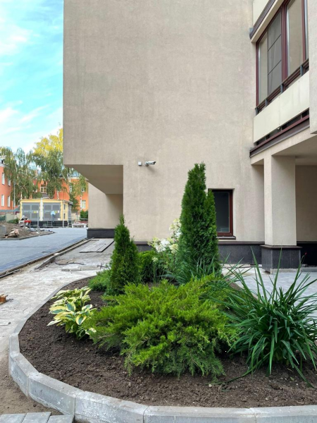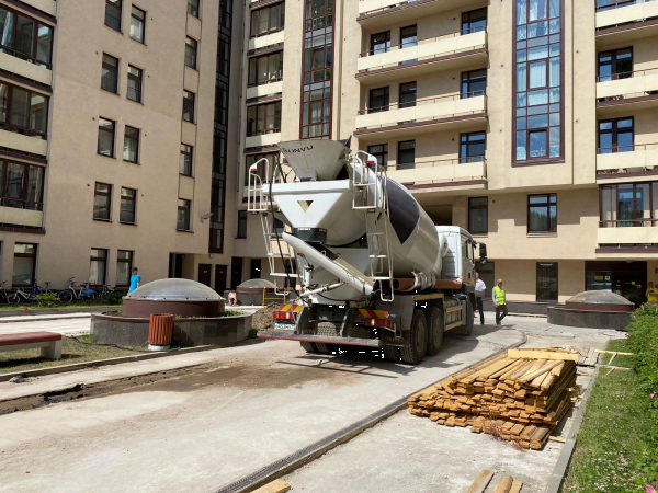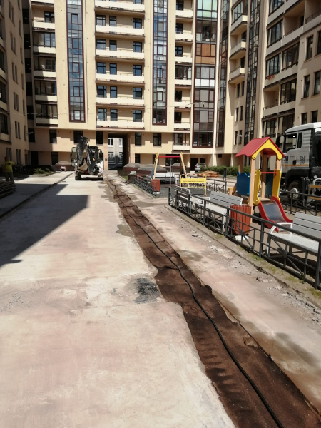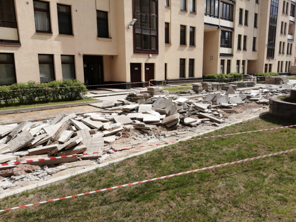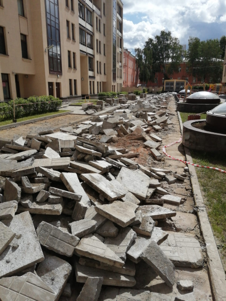 Благоустройство ЖК "На Гребецкой" Пионерская, д. 16 ПС СПб. Замена мощения 1530 м2, устройство - перенос газонов, озеленение территории, декоративное освещение территории. Готовность 95%.